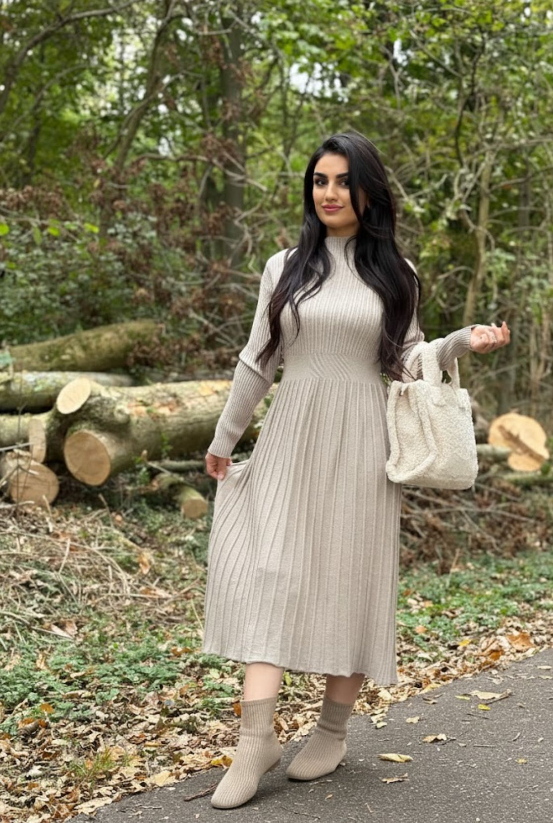 Lange Geplooide A-lijn Geribbelde Gebreide Jurk