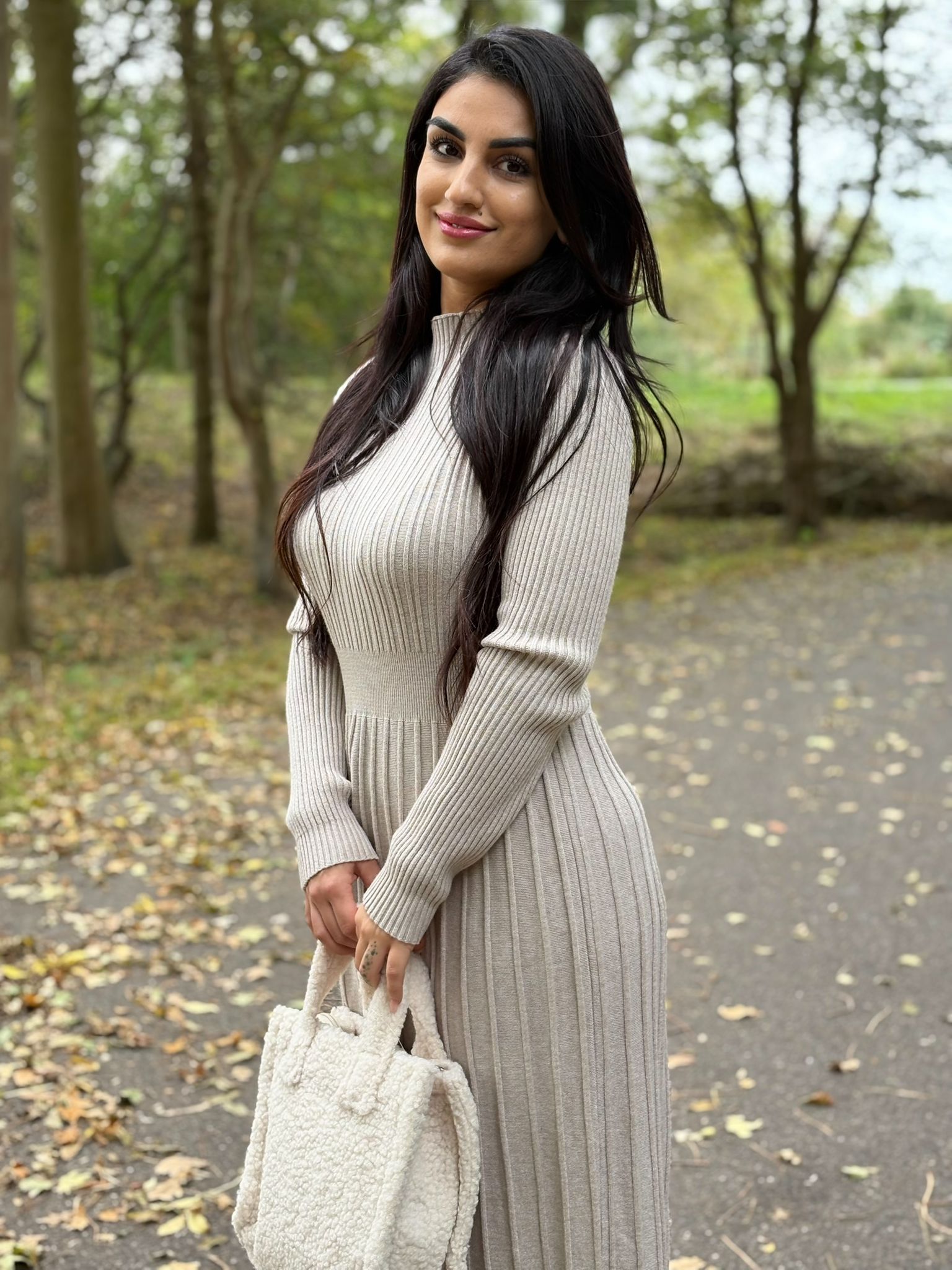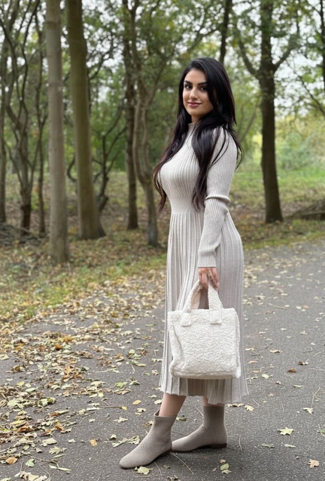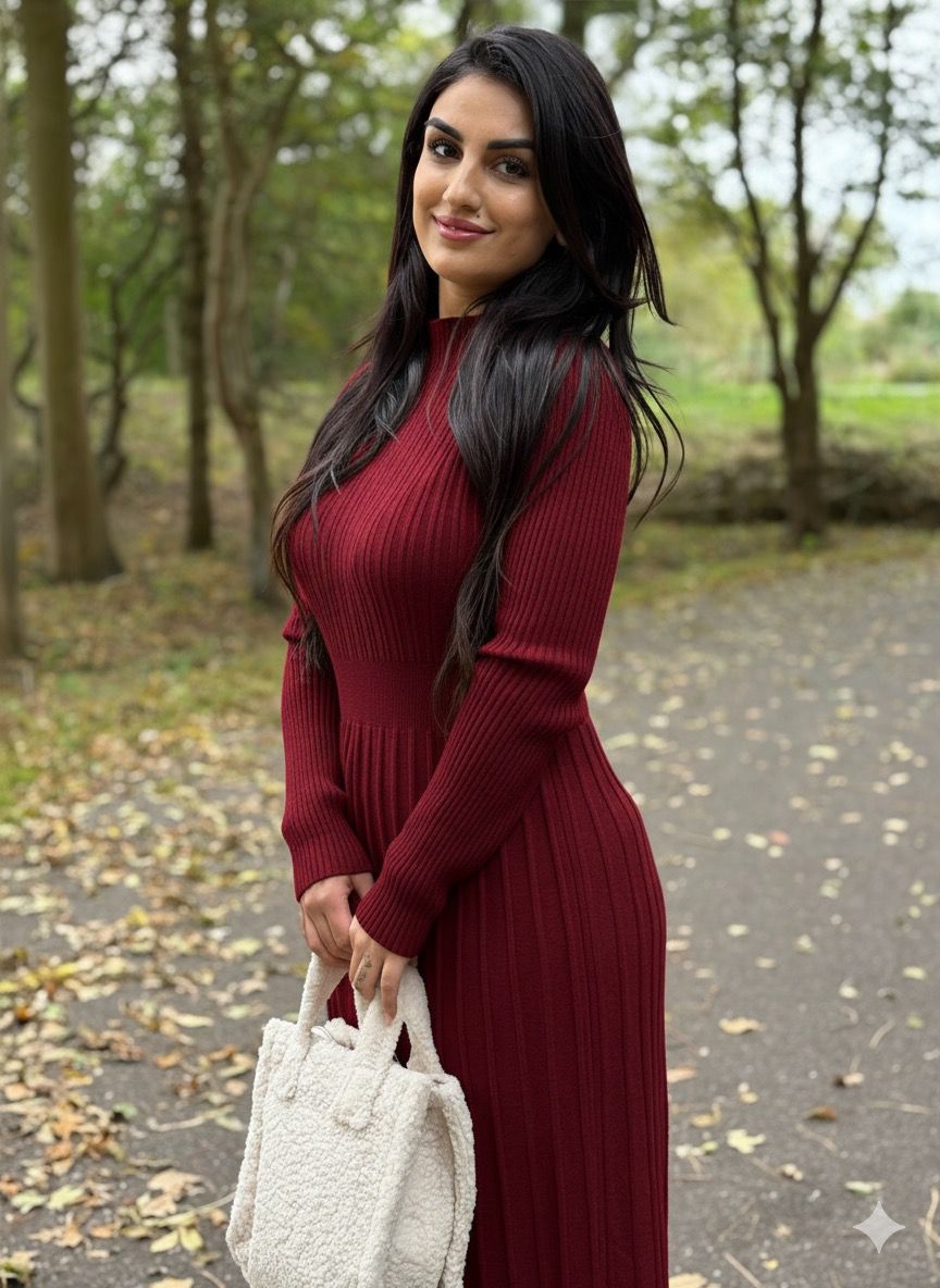 Stijlvol en elegant, deze jurk combineert comfort met een flatterende pasvorm. De fijne ribbelstructuur accentueert het vrouwelijke silhouet, terwijl de geplooide A-lijn voor een vloeiende beweging zorgt. Met een ronde hals en lange mouwen is deze jurk perfect voor zowel casual als formele gelegenheden.